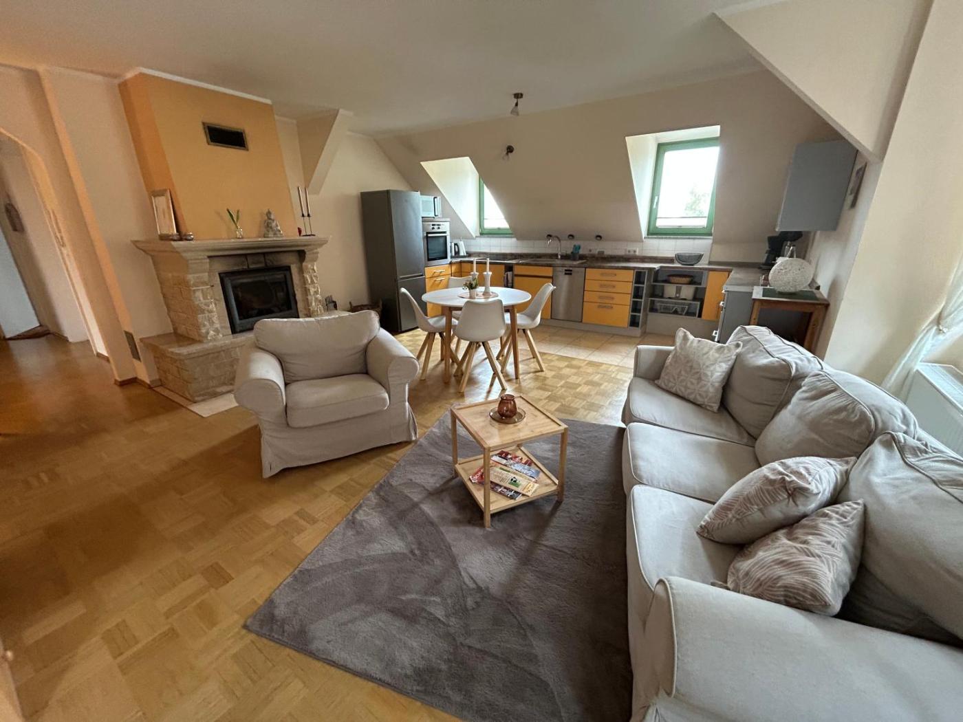 Apartment mit 2 Schlafzimmern. The fireplace is a top feature of this apartment. This spacious apartment comes with a kitchen, a seating area, 2 separate bedrooms and 1 bathroom with a walk-in shower and a bath. Guests will find a stovetop, a refrigerator, a dishwasher and kitchenware in the well-equipped kitchen. The apartment also includes a barbecue. The apartment features a flat-screen TV with satellite channels, a washing machine, a tea and coffee maker, a dining area as well as garden views. The unit has 3 beds.