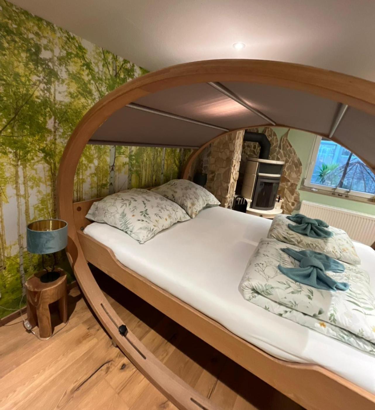 Familienzimmer mit eigenem Bad. This family rooms special features are the sauna and the fireplace. The spacious family room provides a washing machine, a tea and coffee maker, as well as a private bathroom featuring a bath and a shower. The fully equipped kitchen features a stovetop, a refrigerator, a dishwasher and kitchenware. The family room has parquet floors and offers a wardrobe, tumble dryer and a quiet street view. The unit offers 4 beds.